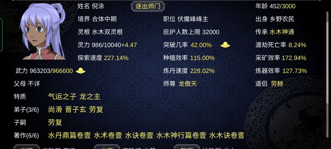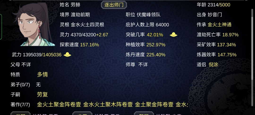 气运之子:运气好,第一个弟子刷了两三回就出了 后面结了个更厉害的伴侣;第一个天阶装备也是其他门派送给他的,然后开始宗门大比钓弟子的天阶装备。(也没钓到多少件,才弄了两轮就遇到这么变态的魔修攻打)