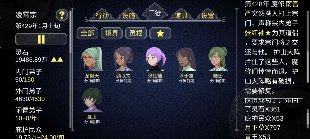 那我后面是怎么解决的呢? 掌门一死我按暂停看记录,发现护山大阵可以挡住,算了一下材料价格,我就拆掉一个弟子身上的天阶装备卖出去买材料连升了两级护山石才挡住了攻打。