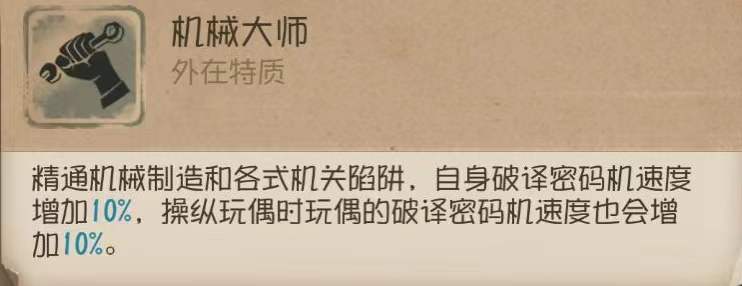 ★实战注意:破译速度的提升搭配【机械操纵】,会让机械师在自身安全时极大的提高团队的破译效率,但同样提高了其在监管者追击目标中的优先级,这里要注意机械玩偶只有在操控的情况下,才享受10%的破译加速。