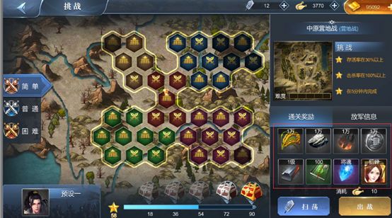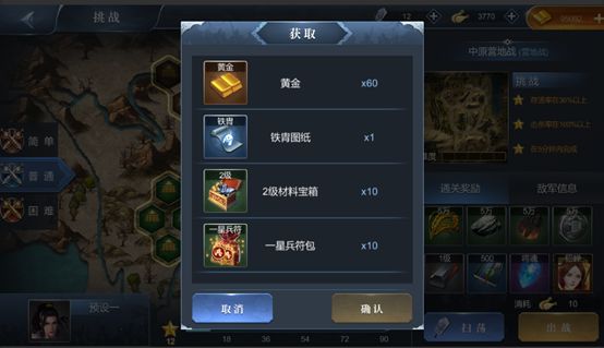 挑战关卡是单人战役,通过后会给大量奖励,并且解锁相邻的关卡,游戏需要的资源,材料,装备图纸,武将碎片,兵符碎片都可以在这里通过战斗获得哦。三星通关后,可以解锁扫荡功能,使用扫荡令,里面刷出关卡奖励。为大家养生护肝哦。PS:士兵在挑战关卡战斗不会受伤,重伤士兵也可参战。