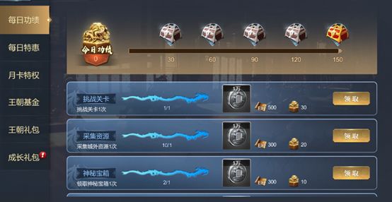 第四个是稍稍需要点精力的每日功绩了,任务很简单,动动手指就有数万资源,加速,黄金等超丰厚的奖励了。每日必做哦。