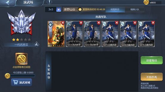 如果感觉技术不佳,也可试试1V1模式练习一下。1V1模式不计入段位,不会担心降段哦,胜利照样给演武币!演武场开放时间有限制,早上9点至凌晨2点,其他时间无奖励,切记! PS:士兵在演武场战斗不会受伤,重伤士兵也可参战。