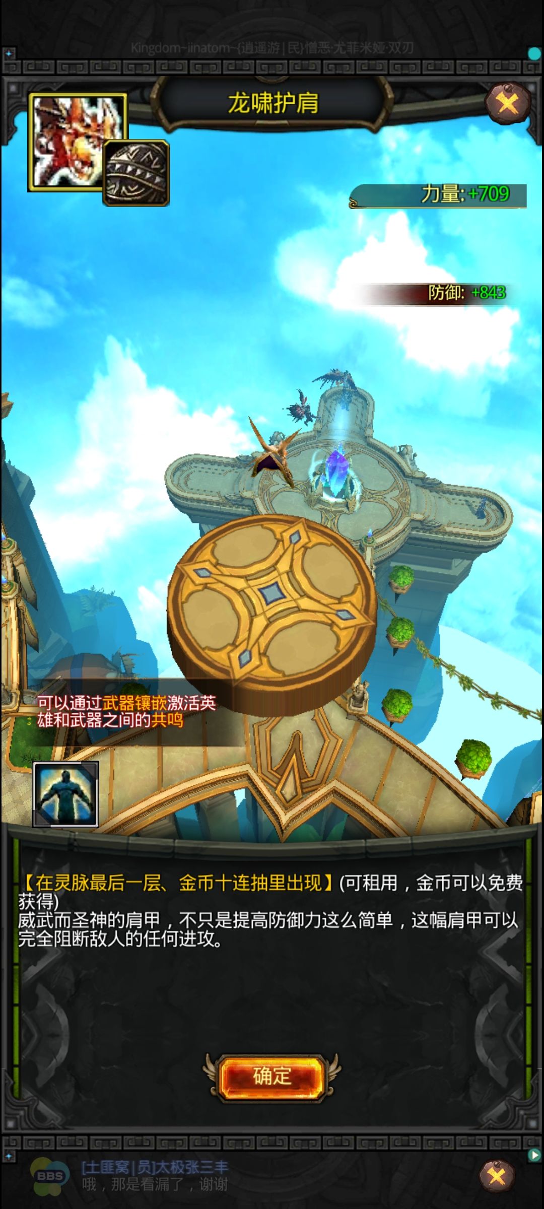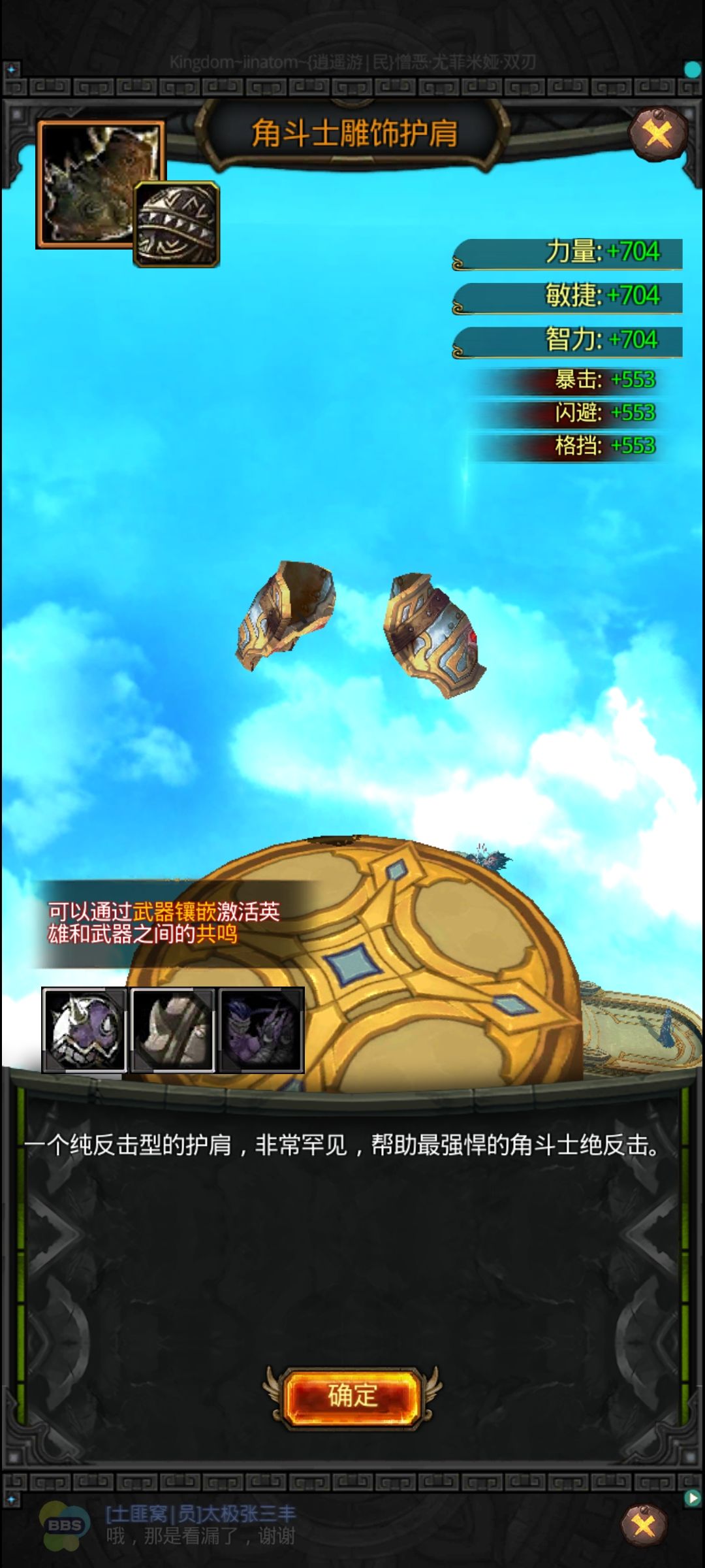 肩部选择:最优龙啸护肩(需求太大一般轮不到他),恶魔苏醒跟角斗士都非常搭,其次是反击甲、龙鳞、**、德鲁伊、胜利这些功能甲,智力甲不考虑