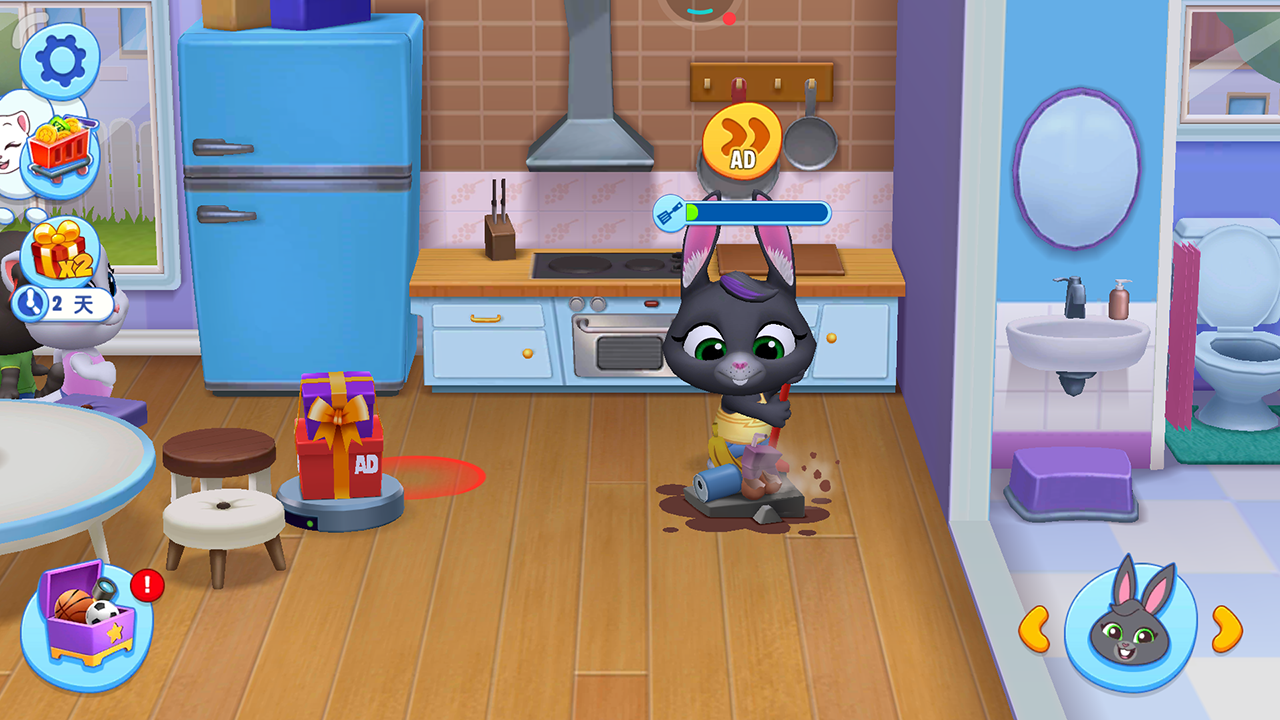 在《汤姆猫总动员》里面,汤姆猫这几个小家伙的生活其实跟我们的差不多:肚子饿了就要去吃饭,内急的时候要上厕所,累了就要去睡觉休息......然后住久了,大房子里也会变得脏乱,地板布满灰尘,或者堆着垃圾。如果没人去搞卫生,很快就会变得臭气熏天,还容易生病。好在这群小家伙还是比较爱干净的,会想到要打扫房子,有时候是贝卡兔,有时候是汉克狗,总之他们谁有空的时候就会主动提出负责那一天的家务。