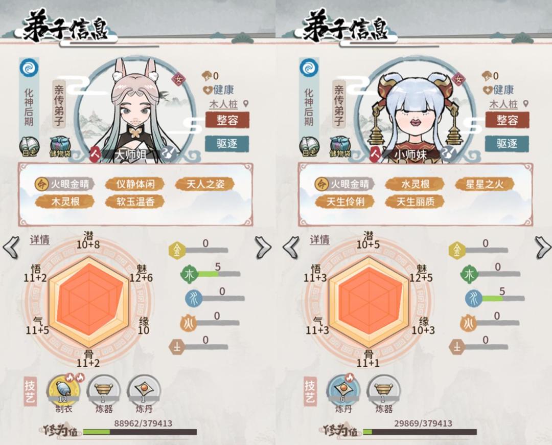 我其实原本是抱着满氪的准备进游戏的,可自从198元买了15矿小师弟又刷出N个15矿工具人后,可自从达到元婴开启擂台赛看到神仙们后、可自从被拍卖场掏干净灵石后、可自从发现造不起装备、强化不起装备、炼不起丹后、可自从发现药材和装备胚子越来越多后、可自从发现被炼虚大圆满们完全卡住后、可自从发现野外+炼丹+根骨的技能加错人后、可自从发现抽卡毫无保底(抽卡后若出现重复工具人金弟子则完全无用)全凭运气后、可自从发现神奇的整容与魅力数值关系后、可自从发现能先去看图鉴再制造想要的特性装备后……所以,目前我实际只占了上面的第5项,就当作造房子游戏玩啦。