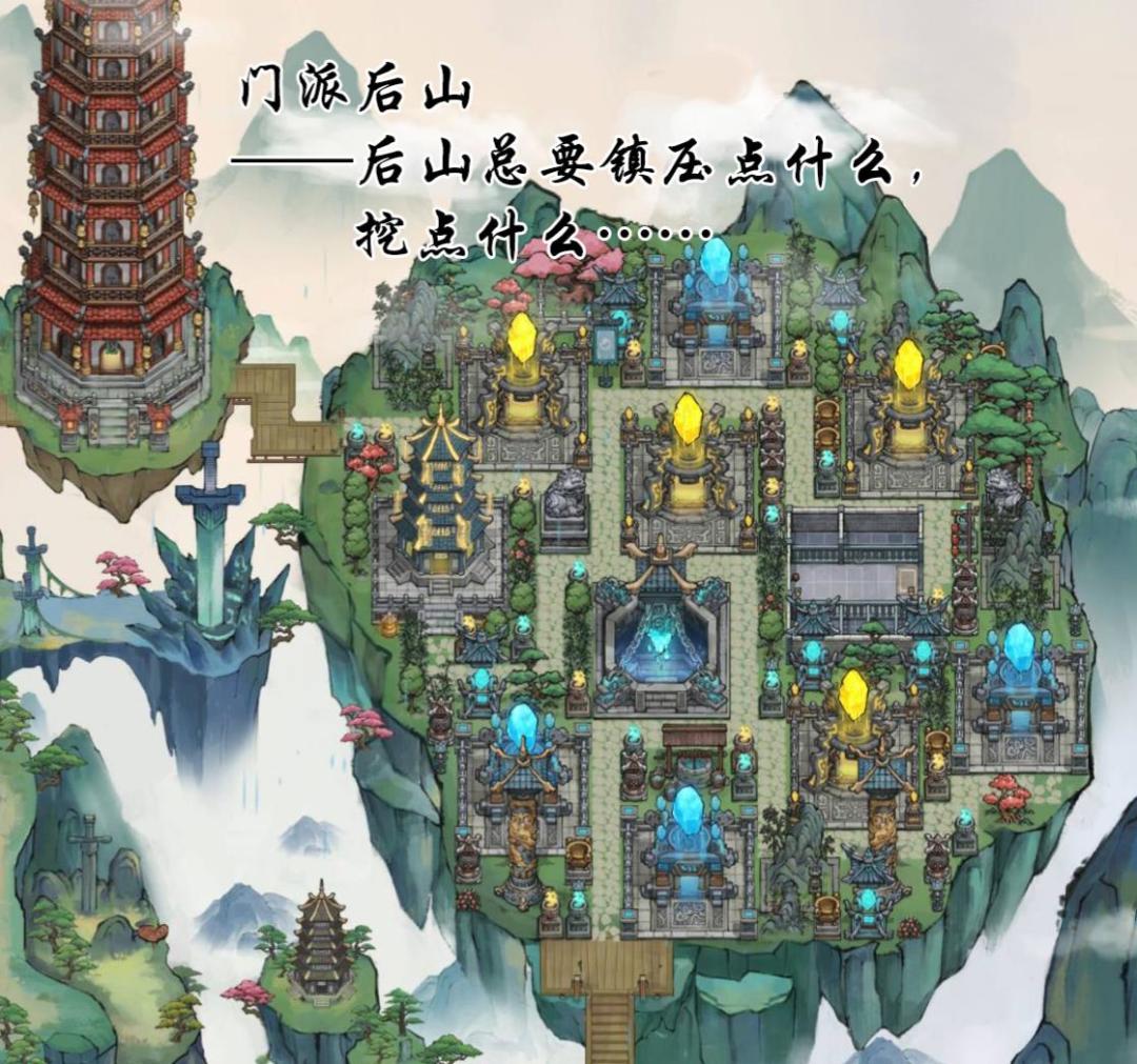 沿着小路来到后山,似乎所有小说故事里的门派后山,总有那么些奇妙神秘的元素在后山里,要么是镇压了什么高手,要么是后山绝壁山洞里有什么绝密。于是燃小灯派的后山,结合公共区域两座大小塔,把收割我灵石用的爬塔和丹狱摆在这儿。传说这些蓝色黄色的矿山挖空后,就能挖出神秘大BOSS……