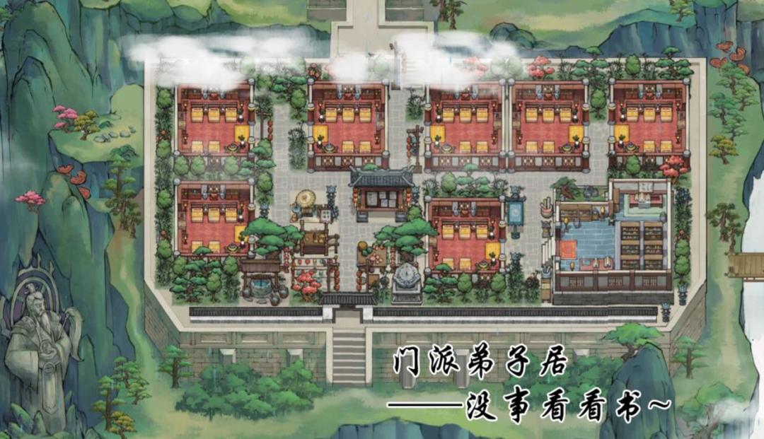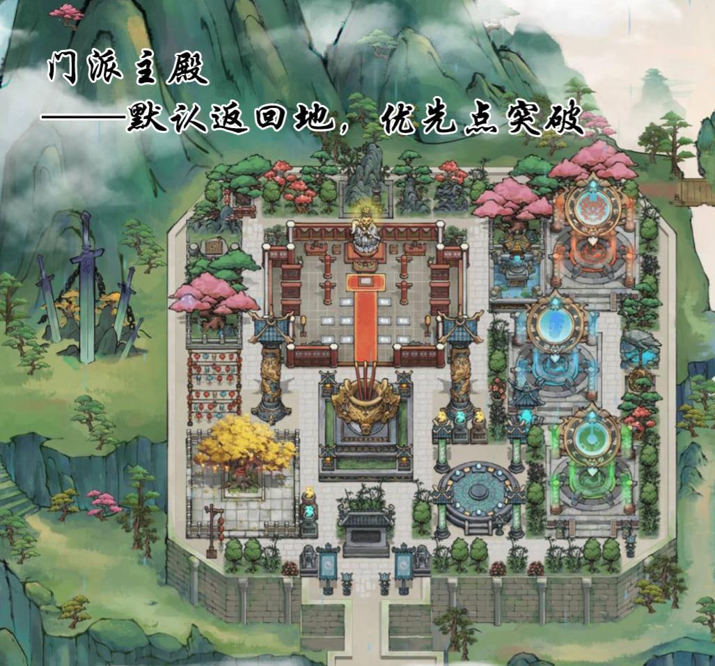 从弟子居沿着主路在往上走,就到了祖师爷殿了,祖师爷在哪,游戏默认回门派就会在哪,所以附近放一些常用建筑就好,比如每个月都有新弟子要突破什么的,要一个一个点,那突破就挨着祖师爷殿了。