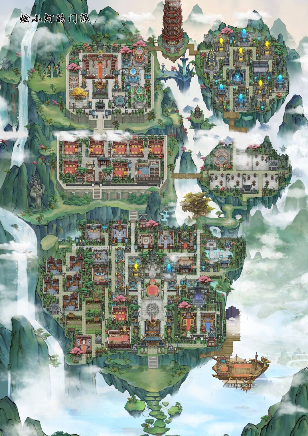 所以所以,来看看燃小灯的门派吧哈哈哈哈哈!!审美是按个人口味来的,既然是修仙国风嘛,就走【错落有致】作为主要原则来布置啦。然后留意每个建筑,会有一个“门”或者“阶梯”的地方,用这个地方连路可能逻辑上更通畅(没实际意义)。