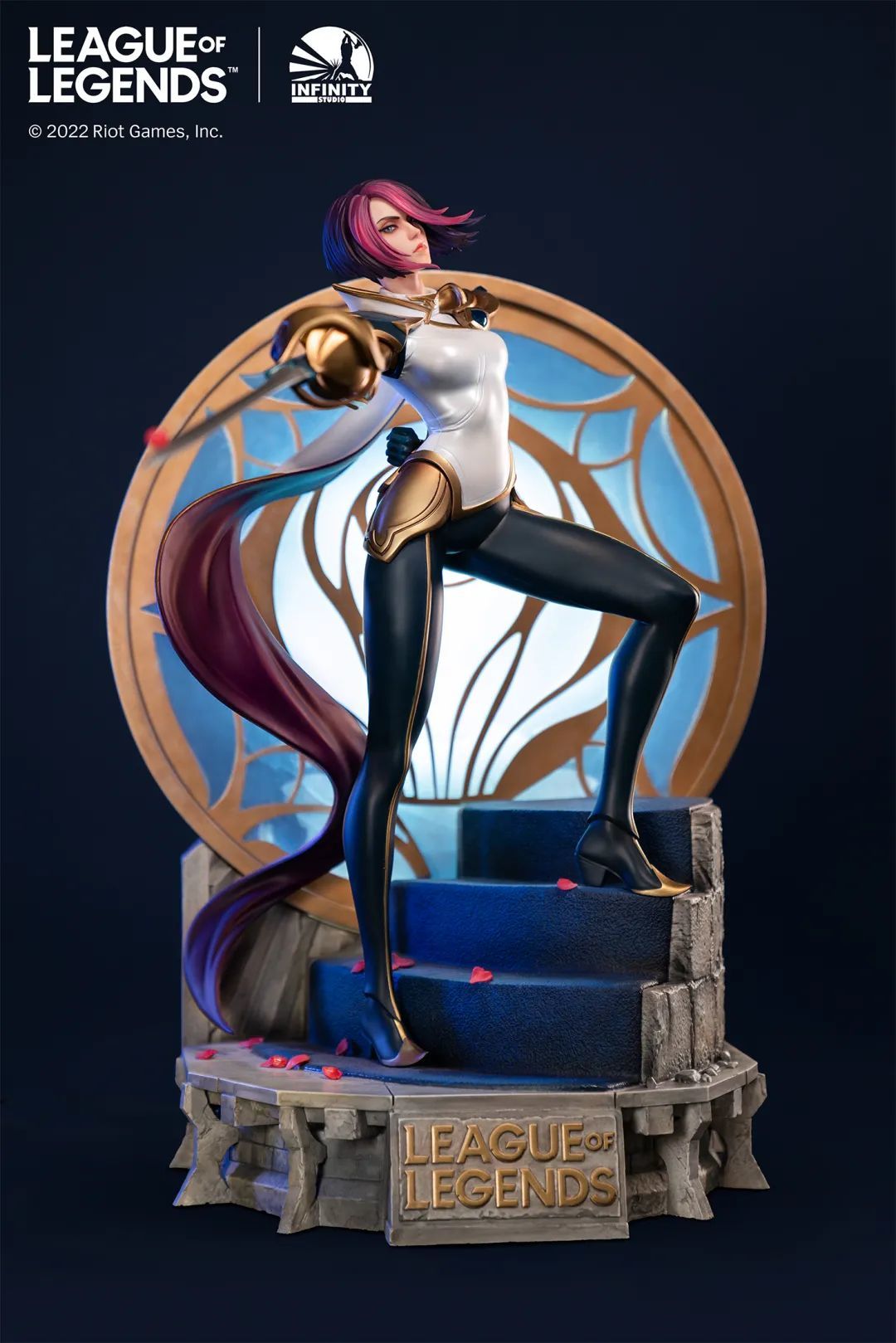 在底座方面,也尽可能还原了菲奥娜原画中的背景。劳伦特家族的族徽,象征着菲奥娜至高无上的荣誉,而地台则是融入了德玛西亚的元素,完美展现了菲奥娜在游戏世界观中的身份与地位。