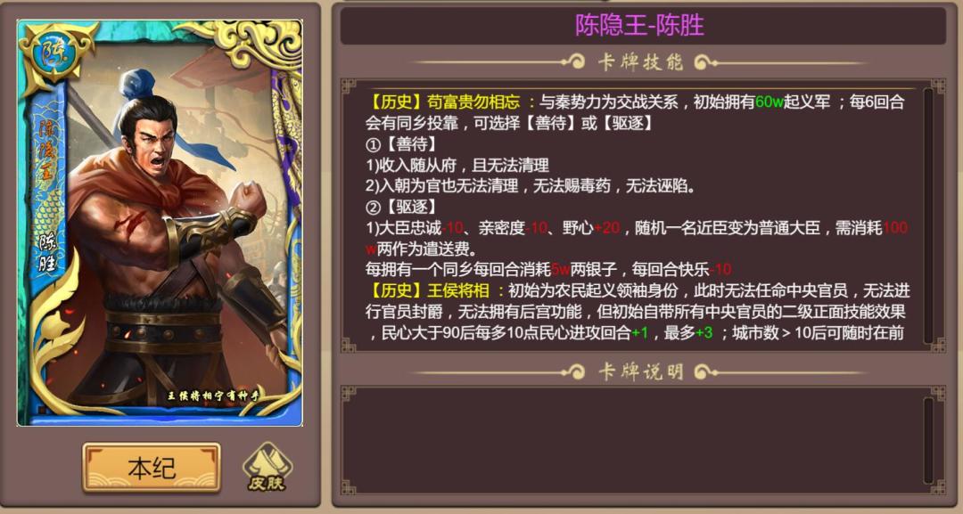历史模式下,初始拥有60w起义军。早期做劳役时曾言“苟富贵,勿相忘!”,成事后同乡前来投靠,如若驱逐将会产生各项负面效果。