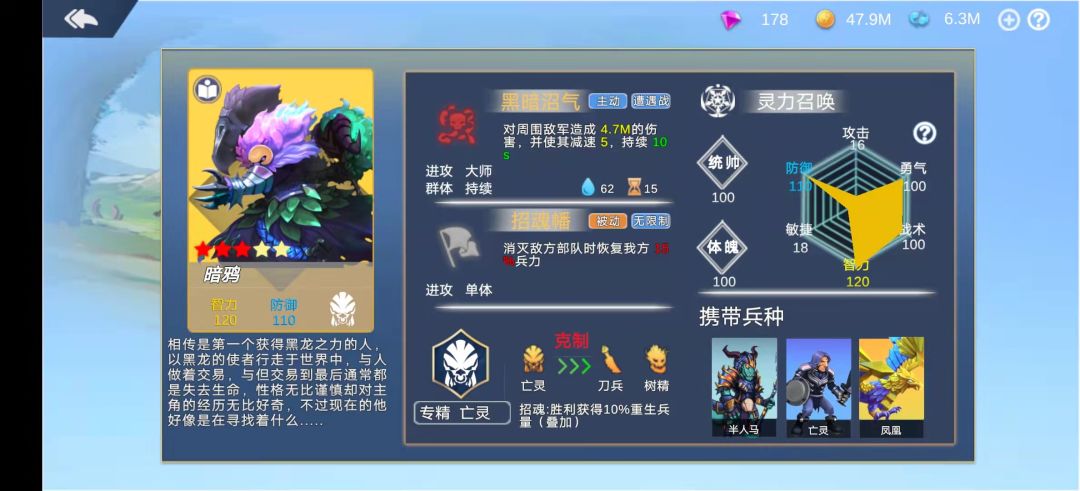 因为变更攻击的话,菜刀亡灵能更快就起来了),现在改了的话暗鸦是加强的,我昨天刚更新完我以为是削弱了因为单看技能真的是,后来经过大佬的一堆分析,加上自己拿出去打了几个图之后发现,的确强了,强在哪里?第一,前期叠兵速度加快了,虽然技能伤害秒伤比以前提升得不多,但是打前期小怪来说够用了,自己可以带一路拆一些小箭塔来进行叠兵了,第二被动生效了,就是杀完一堆兵之后,亡灵的被动加上暗鸦的被动,兵一下就起来,暗鸦这被动实际是增加了兵的数量,而不是直接恢复血量,这也延申出了,暗鸦可以拿被动来叠凤凰,但是叠凤凰会跟多萝西冲突了,而且没了专精,也是需要时间(没多萝西单纯有暗鸦的可以考虑直接暗鸦带凤凰,一样能叠起来,而且凤凰兵种的伤害比亡灵高多了)。叠起来就是没了英雄的攻击加成而已。大家自己看着来吧。