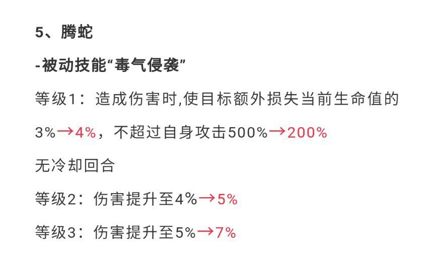 而对于灵阁boss,活动boss等高血量对象而言无疑是削弱,但依然可以去开发新套路。因此我认为影响不大,腾蛇本次调整总体上还是增强。