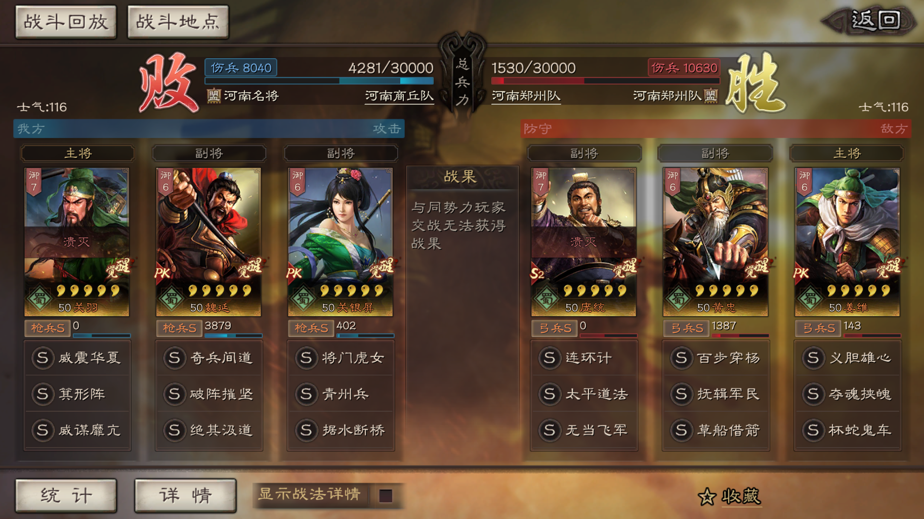第五轮:商丘队骑兵VS济源队器械,商丘队胜。商丘队派出了五谋臣,而济源队由于只剩下器械队可以出场,只能强行迎战,虽然张飞和马超输出都很可观,但已无力回天,商丘队赢得了本场比赛的冠军!