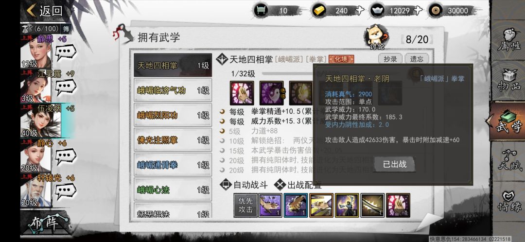 3.纯阴体天地四象掌暴击自带60减速,配合玄阴真经、玄阴真经逆、纯阴体共80%debuff增幅,一拳直接打出减速极。