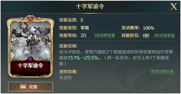 都是一个效果:使两人的治疗效果和伤害效果提高。不同的是散兵战术是稳定的施加给两个副将,但是有受伤加深的DEBUFF,而十字军谕令则是单纯的增益效果,只不过不稳定。没有一定的优劣,都可以使用。⑨向晚一身当道食, 山中麋鹿尽无声:猛虎破柙