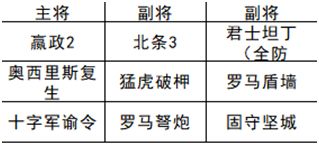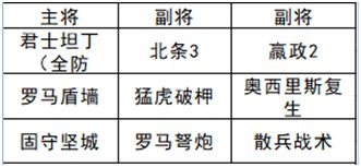 思路:首铁三角的核心思路(输出+坦克+奶妈/辅助),对应输出北条,奶妈嬴政,君士坦丁坦克。十字军/散兵战术同时增强输出和治疗效果,固守坚城提供抵御效果。