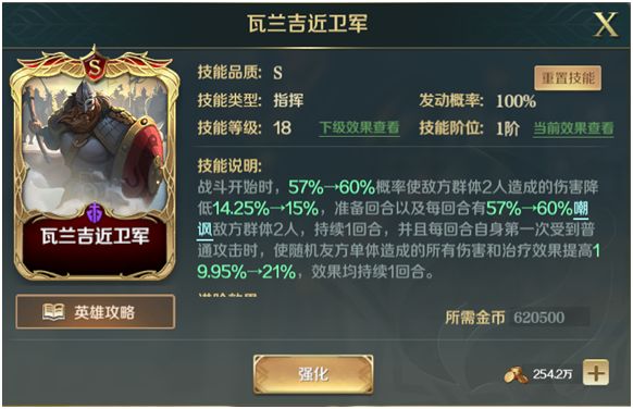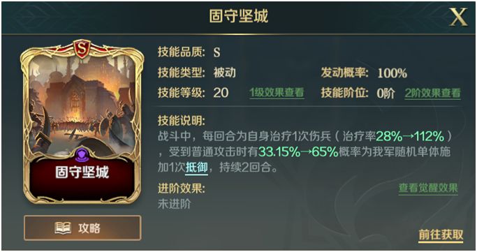 这个技能首先是作为对嘲讽英雄自带技能的补充,其次其实也是对嘲讽英雄最友好的效果:提升己身受到的治疗将近一半的效果。同样作为指挥技能,不会受到眩晕、沉默等效果的影响。携带者就如图标一样——像一堵墙一样的保护队友。