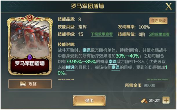 嘲讽三柱国的老大,该技能自带对敌减伤、提高友方治疗效果和伤害效果提高,以及在准备回合就会发动的战前嘲讽,大柱国之名实至名归。 ⑤为了更好的挨打,所以得享受更好的治疗:罗马军团盾墙