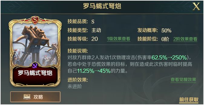 罗马蝎式弩炮作为恐慌队的核心输出技能,极力推荐由高力量英雄诸如北条、项羽来携带,技能额外提供的高额力量加成会让伤害达到一个让人叹为观止的程度