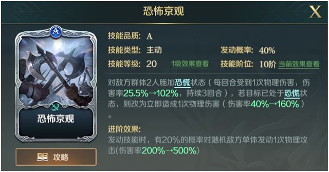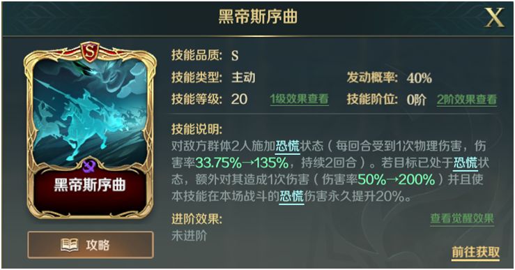 d.黑帝斯序曲优于恐怖京观的第三点:造成额外伤害后,本技能本场战斗造成的恐慌伤害增加20%。这里请大家自己做个小实验或者和小伙伴讨论下:这20%是否可以叠加。