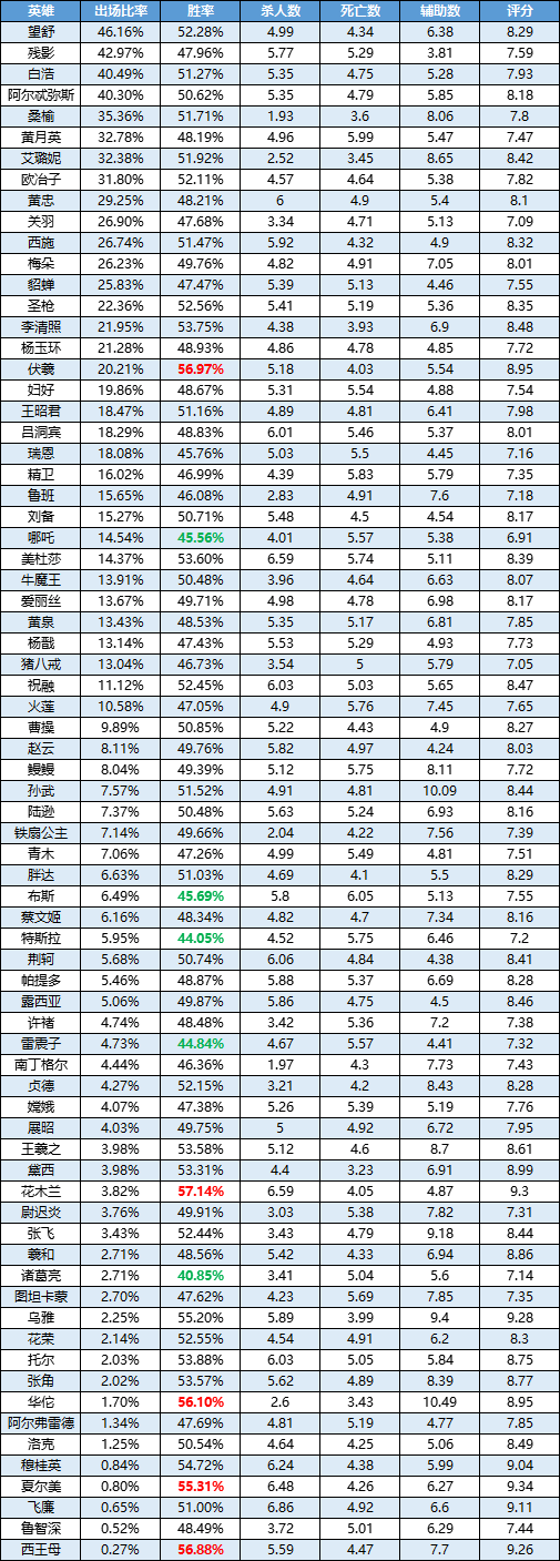 注:此榜单按出场率由高到低排序,标红为胜率前5的英雄,标绿为胜率排名倒数的英雄