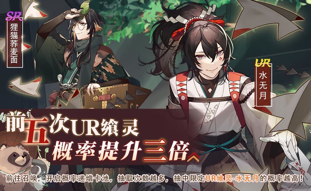 活动描述:活动期间,开启概率递增卡池,UR飨灵-水无月和SR飨灵-狸猫荞麦面限时加入卡池,御侍大人使用专属道具进行召唤,该卡池UR飨灵抽取概率大幅度提升,并且随着抽取次数的增多,UR飨灵-水无月的抽取概率也会随之提升。
