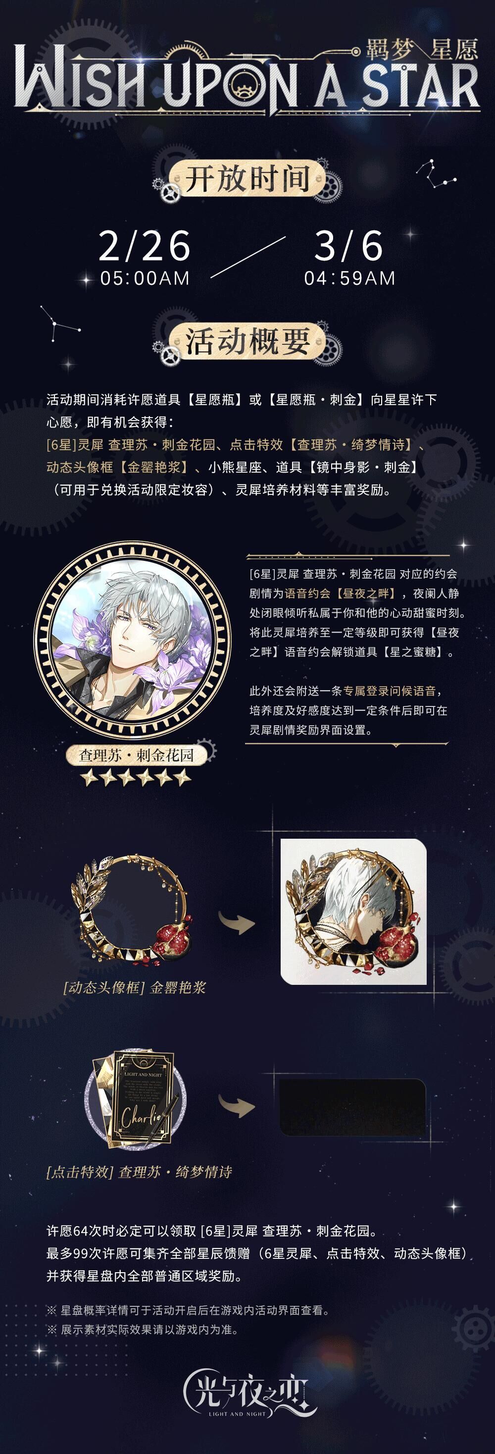 许愿【64】次时必定可以领取 [6星]灵犀 查理苏・刺金花园,达成其他指定次数还可获得专属勿忘等奖励。