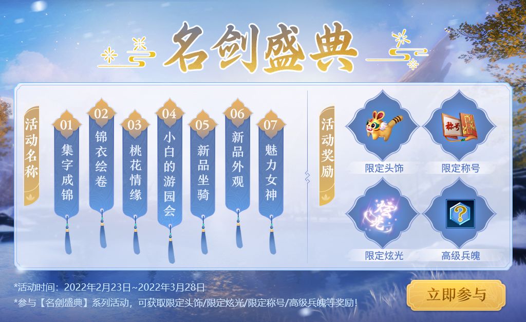 【活动内容】:参与日常活动便有几率获得“名”“剑”“盛”“典”字卡,字卡亦可通过游戏内“赠礼系统”与其他少侠集换,集齐四种字卡可兑换名剑锦匣。