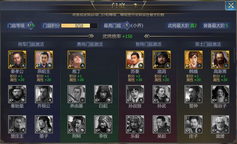 门庭共13级,门挺等级+1即为武将可进阶的最高层级,如达到9级,武将可以进阶到神