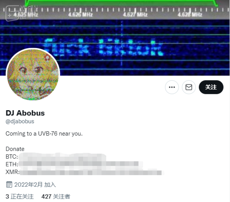 2月5日,ABOBA修好了设备,继续垄断“UVB-76”的干扰广播事业。他们专门开设了推特账号,以便在每次广播前公开节目单,还留下了加密货币打赏链接,摆出一幅要让干扰广播常态化的架势。