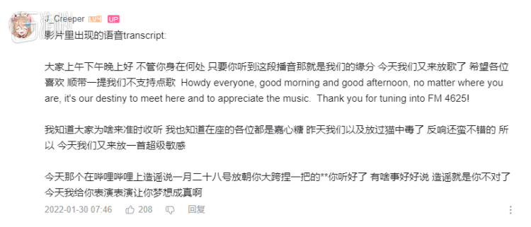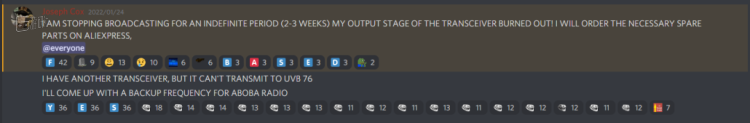 接连数天的高强度广播给ABOBA带来了人气,也给他们的设备造成了负担。1月24日,他们停止了广播,在Discord上解释道:功放管烧了,新的配件要等两到三周后才能送到。