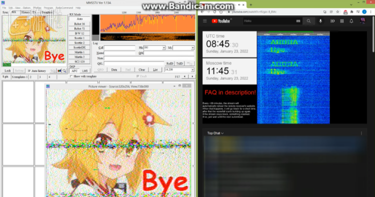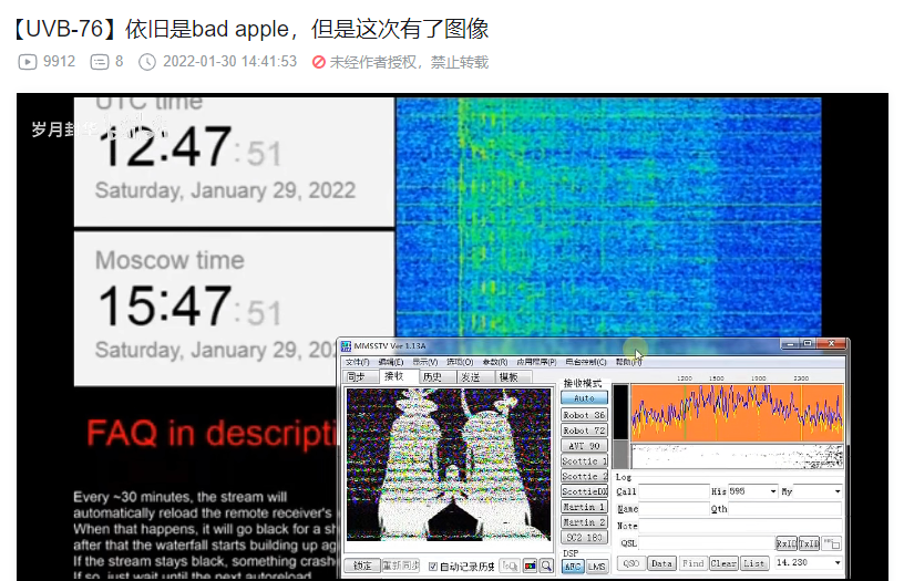 除频谱图之外,他们还首次在干扰过程中使用SSTV(慢扫描电视)技术,传输二次元图片。SSTV是一种基于短波无线电的图像传输方法,能够以缓慢的速度传输一些单色或彩色的低像素图片。尽管只有Ham知道如何接收这些图片,但转发图片不过是普通人动动手的事情。