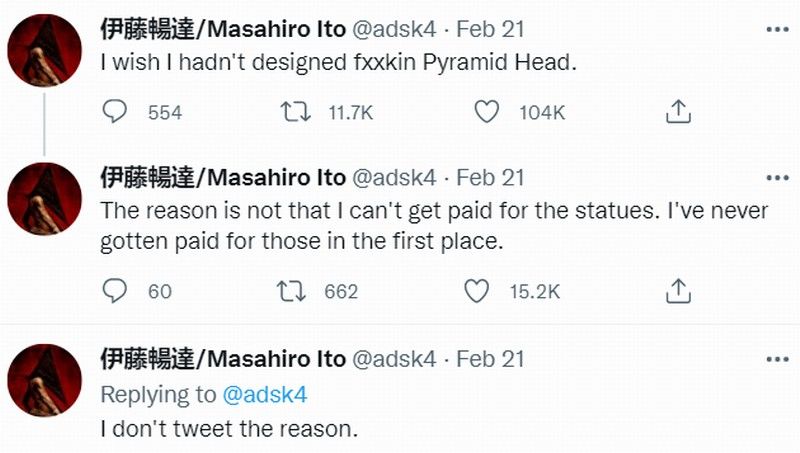Ito)在推特上发文称,他希望没有设计过三角头。有人询问为什么?他表示不想分享具体原因,并且后悔的原因与三角头版权收益等无关。
