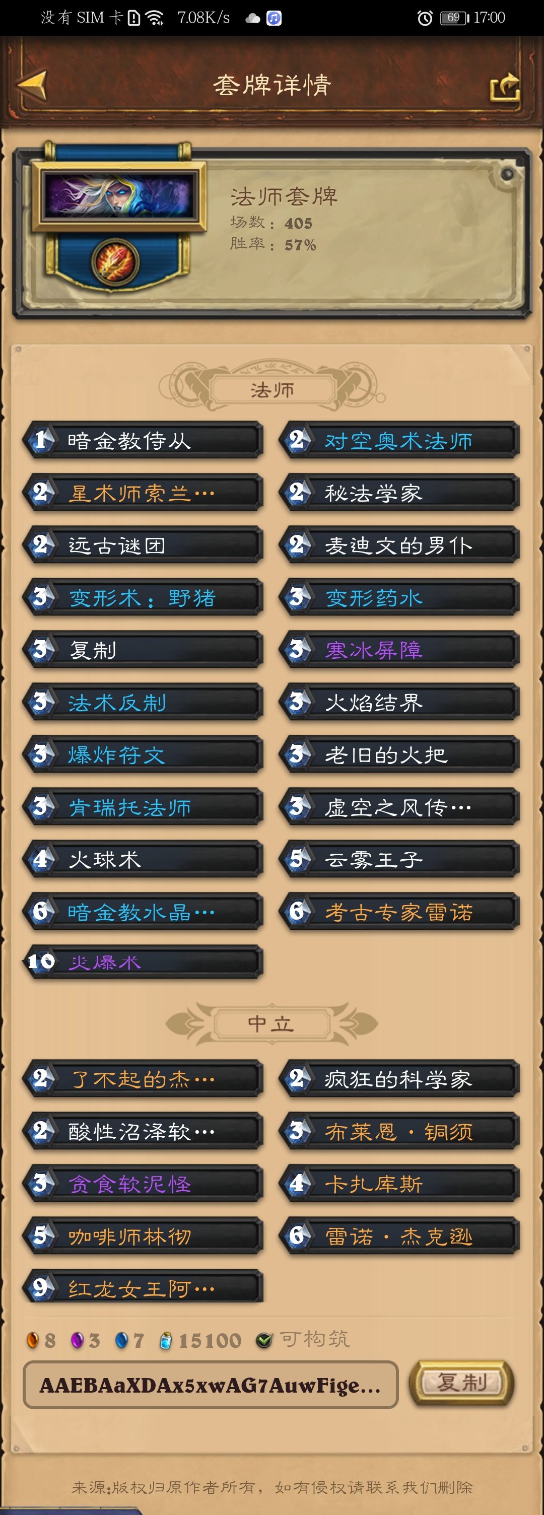 其他职业我实在是写不动了,因为遇到的不多,没有什么参考价值,我们打奥秘法是大劣对局,能找到雷诺赢一半,这副套牌是我一点一点的改进的,综合胜率在55%左右,码字不易,祝大家早日上传