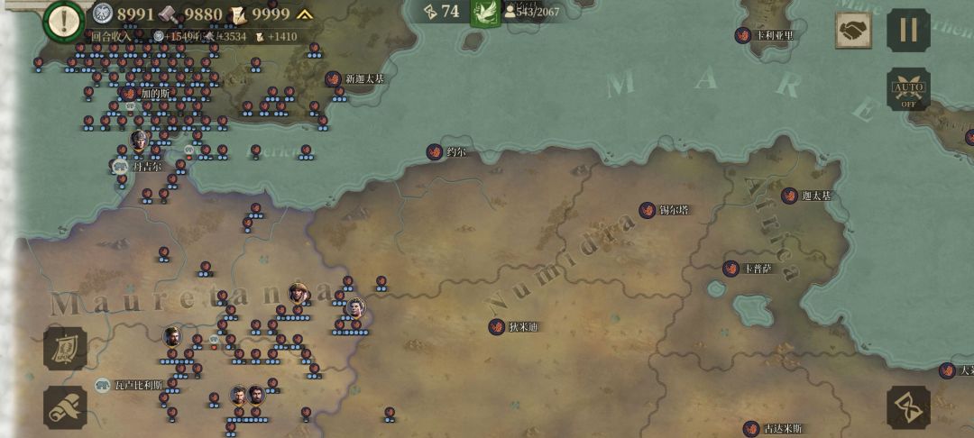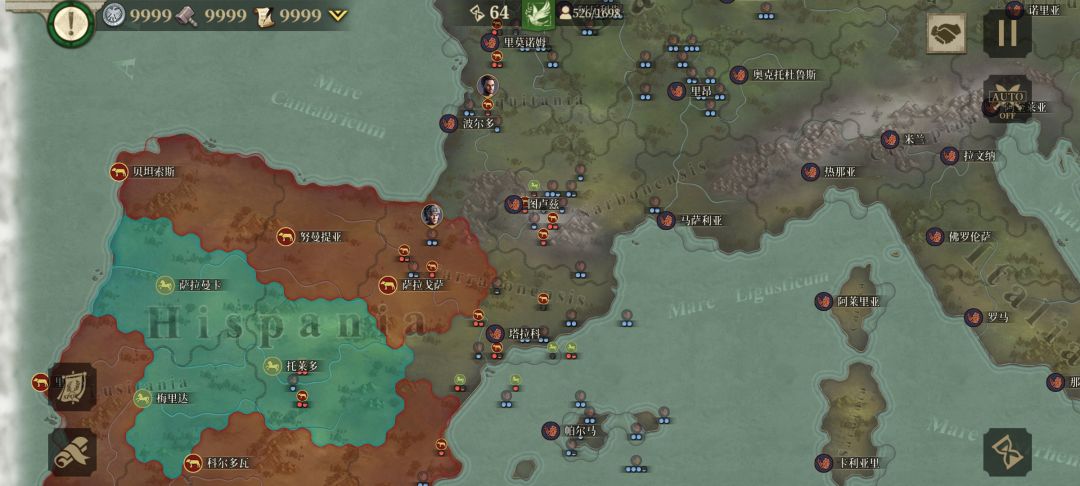 我先与周边盟友歼敌军,待平定后我掉头,调点兵把盟友的家占领,按照这个思路我建立了东起小亚细亚、东欧平原,西到伊比利亚半岛;北临北海,南望中非,囊括地中海、爱琴海、黑海的封建君主等级制的帝国,从偏安一隅的本都王国的附属国到以罗马为新首都环地中海的大帝国,我用了76回合。