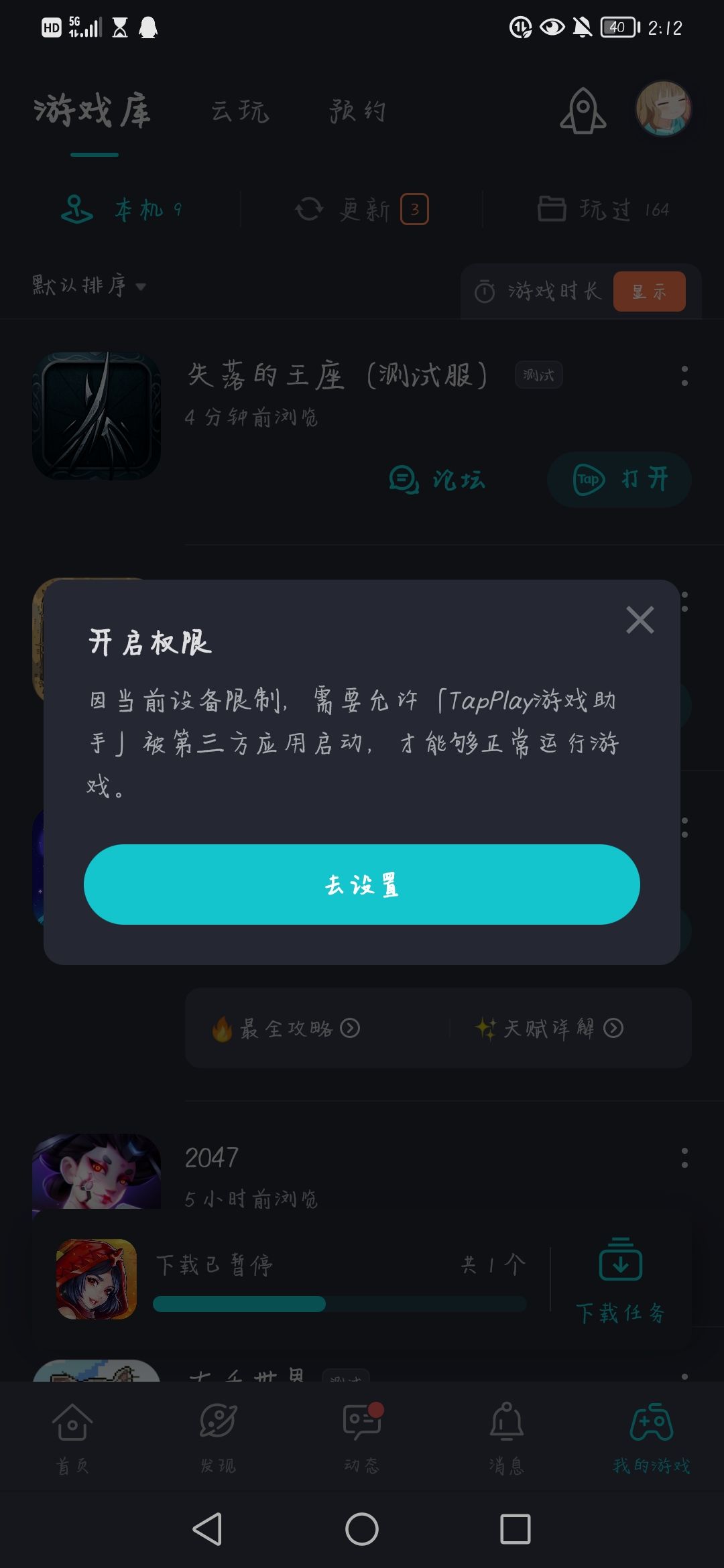 启动第二个游戏然后再切屏,返回tap打开这个游戏,你就可以进了