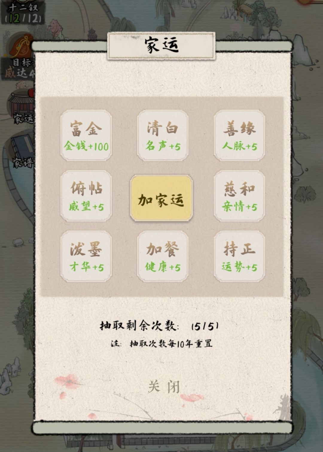 加家运随机,可以抽取5次,前两次免费,后三次看广告,每十年重置抽取次数。