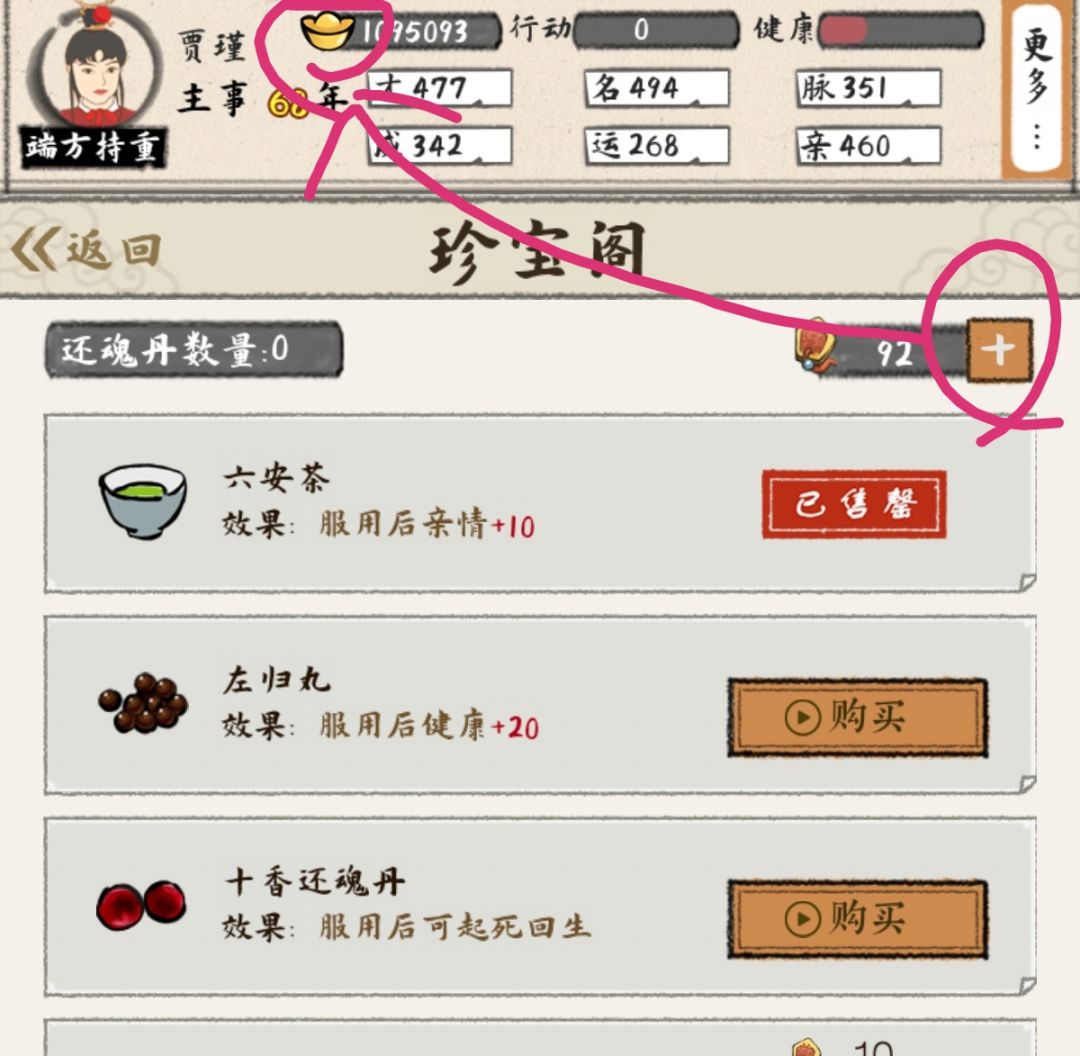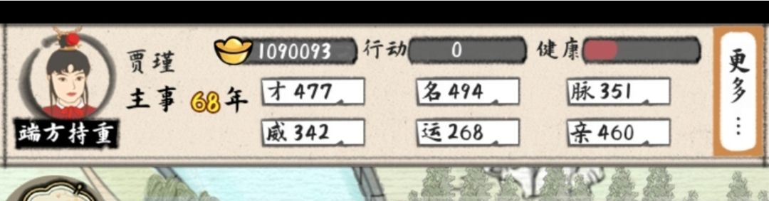 健康:红色是你的血条,见底人物死亡,可以通过地图上的「大观园」-「随便逛逛」+2健康,或者点击下方「珍宝」在珍宝阁看广告买左归丸+20健康