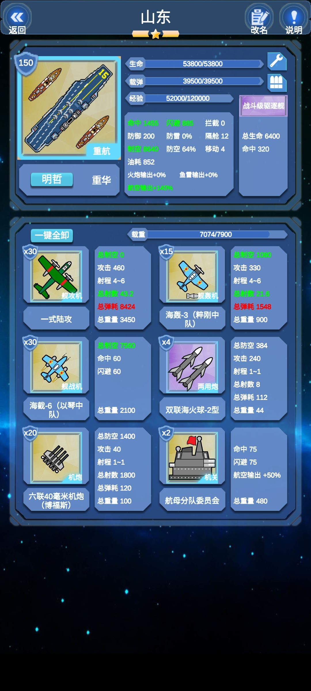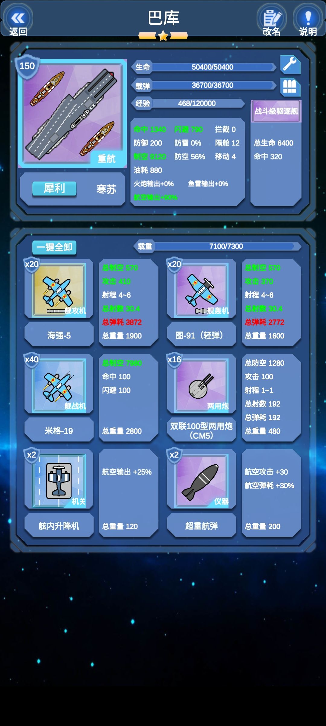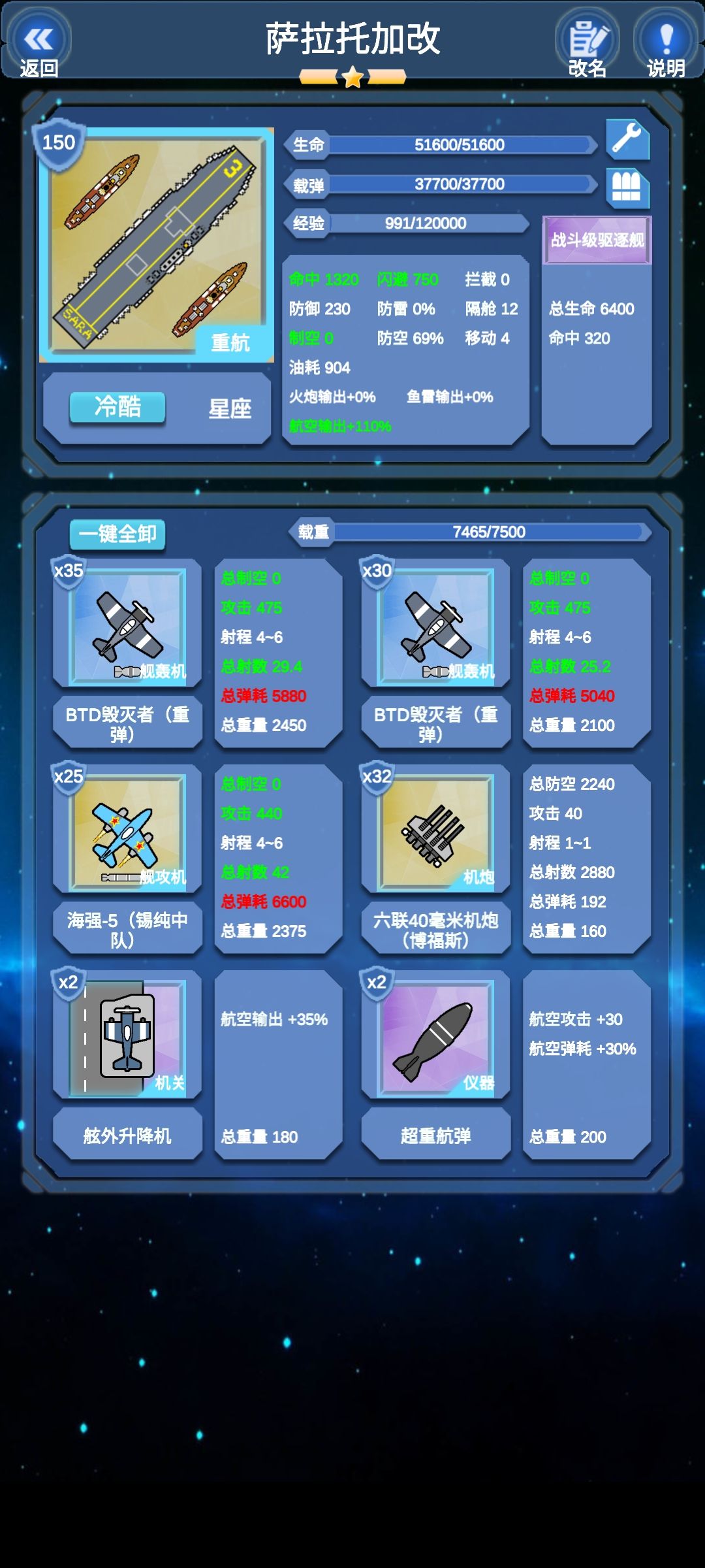 没装银河是为了面板好看(说实话,就一个60银河我强迫症看的难受)。108架的载机数和极高的载重,给了这艘装航极大的后期改装空间和极大的实力,之前我还试过60女妖的魔改版本,1万1千的制空。剩下建议带个弹药库,航母耗弹实在太多了。