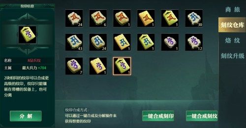 刻纹分别主掌攻击、防御、兵力,同类的刻纹只能装在装在一件装备上,两枚同级的刻纹放在一起合成,就可以升级为更高一级的刻纹,刻纹品阶越高,增加的攻击、防御、兵力也越大,同时也可以增加战斗力,到达一定级数的刻纹,可以合成出更强的烙印,?烙印不损伤刻纹,而且还可以随意和装备分离,就看各位主公如何灵活运用哦。