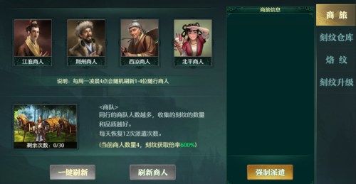 跟着商社商人走,一定少不了好东西,在策略游戏卧龙吟中,商队有着让装备变强的刻纹,同行的商队人数越多,收集到的刻纹数量和品质也会越好,毕竟人多好办事,每天都有12次免费的派遣次数,各种主公们,一定要不断的去刷新,直到刷新出4位商人为止,这样就可以得到更多数量、品阶高的刻纹哦。