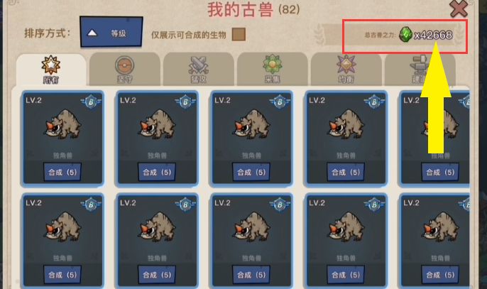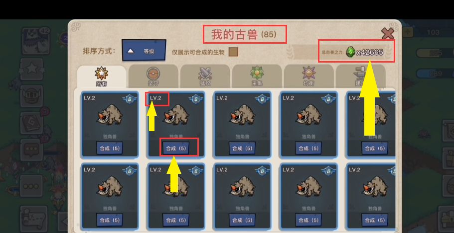 第一步:查看原来的古兽之力,要合成的幻兽等级及其古兽之力这三点