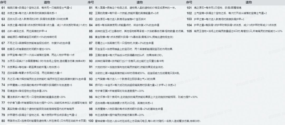 为方便大家讨论,贴心的小矿工为大家准备了游戏内全遗物属性一览表: