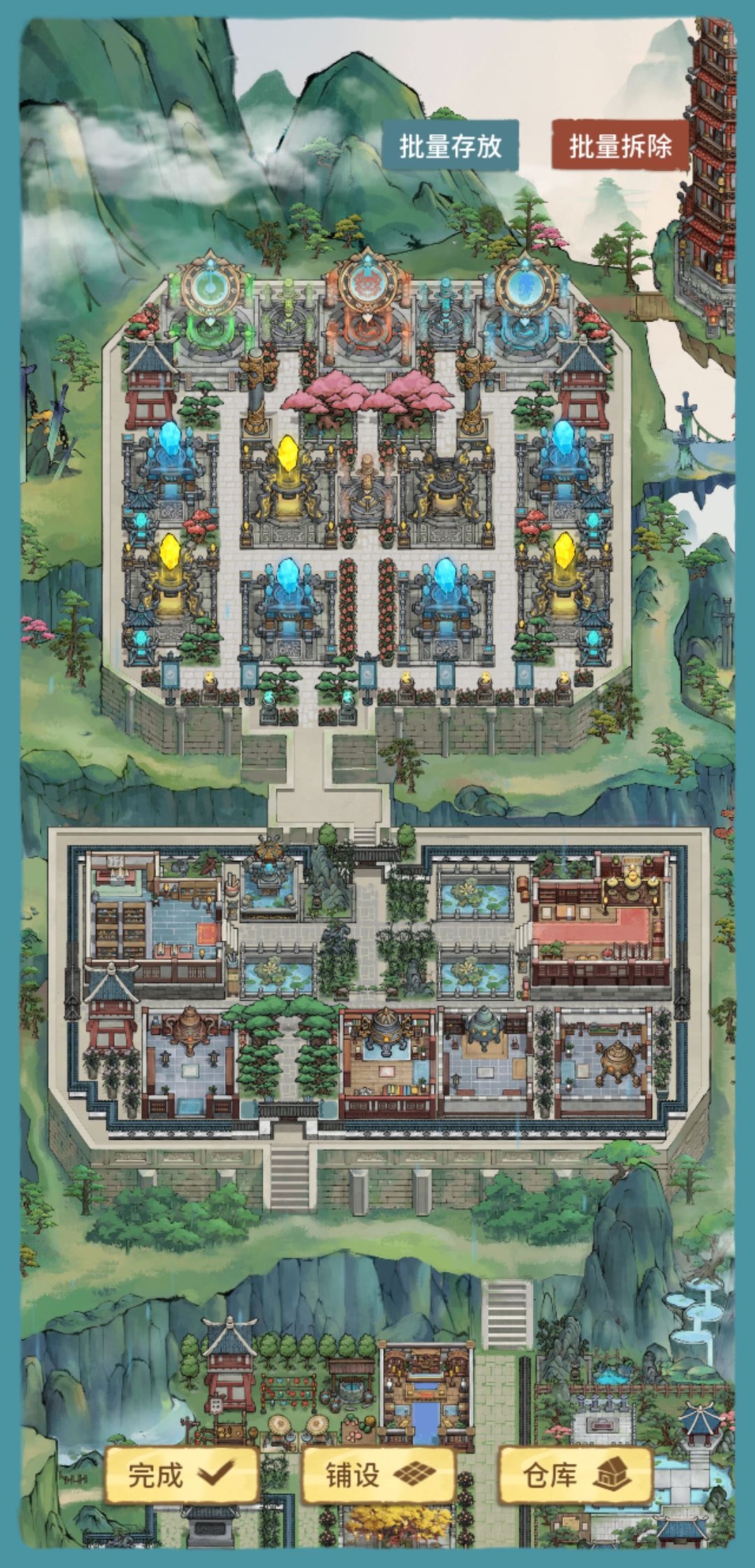 将将就就。。排个图;图一:进门练武场地加互派大阵,有斗无斗气势拿够。两侧厢房弟子能迅速到位,守阵。沿着林荫正路到达大殿,后方园林小院,掌门厢房套着会客厅,以表敬意,手谈下棋,达到目的。图三:右侧英雄纪念碑,掌门出门,牢记往事缅怀。图二:左侧小院,伐木种种植,一坐厢房,记名弟子苦力专用,口渴自己打水喝。后门出去小吃外贸一条街,工人赚点辛苦钱,然后又资本消费给门派,吃点西瓜包子杂货的。图四:沿着阶梯,到达博物院,练衣练器炼丹,藏宝藏经,漫步知识。最后脑力运动完了,到达门派最深处。直接超级苦力工,集中挖矿,两大哨兵,实时监控不准偷懒。图五,传功、参悟,比武场所,师徒授课专用。最后一块地还没打整好。随便摆一摆了😂资本运作门派。