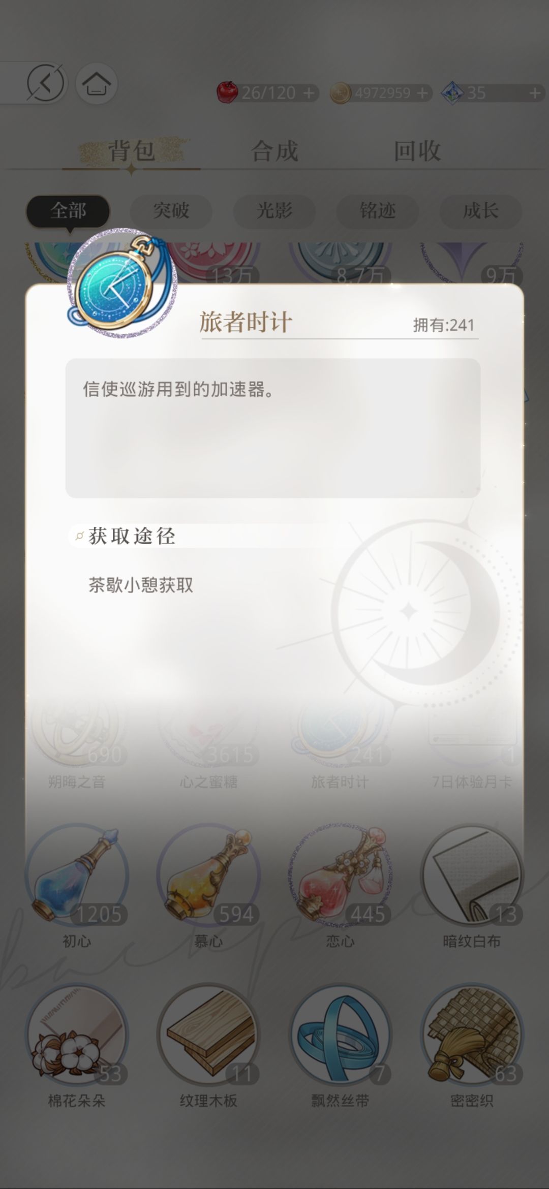 旅者时计,加速用,一次可加速1小时,获取方式改过好几版到现在只能通过在线时长获得(老咸鱼每天基本拿不满)(2022.03.07修改,还可以在商城五区兑换——展会处兑换 每天刷新 基本天天都能刷到 但是不推荐大家换)