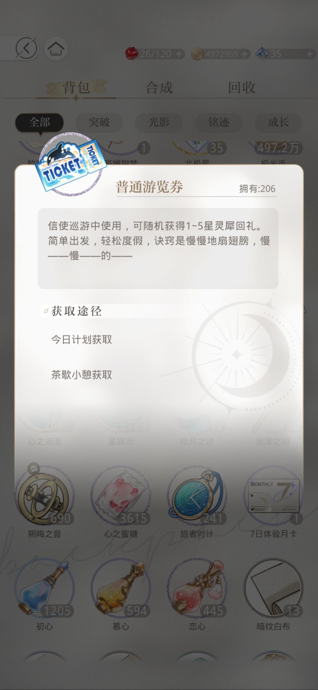 普通游览券,单抽小票,只能通过每日任务和在线30分钟获得,使用后可以获得1-5星角色(是的,普通巡游券也能出五星,所以萌新们前期一定要多巡游!)