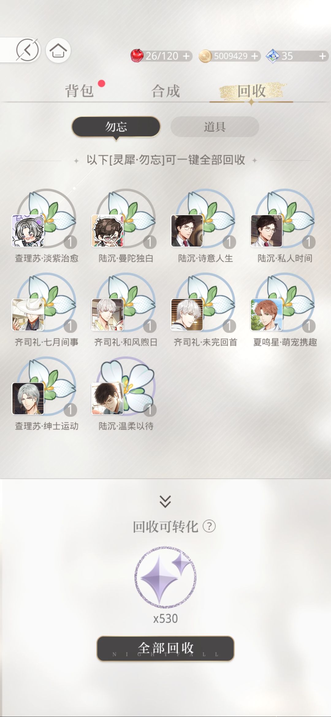 巡游后,出现重复的卡牌可以进行开花,开完五花后,多余的卡牌可以回收(这里注意一点,当且仅当你重复的卡牌实际为五花后,多余的卡牌才能回收,如假如你的卡牌为三花,有三张重复卡牌,此时多余的一张卡牌并不能在背包被回收,所以想要回收就别忘了开花)具体位置在背包,见下图