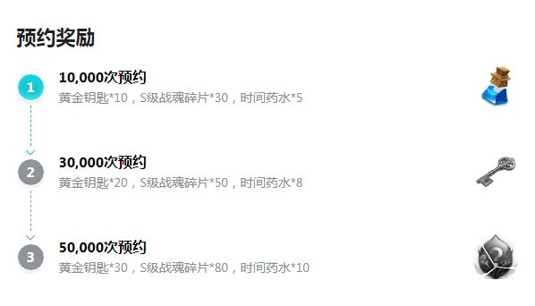 3W次预约:黄金钥匙*20,S级战魂碎片*50,时间药水*8