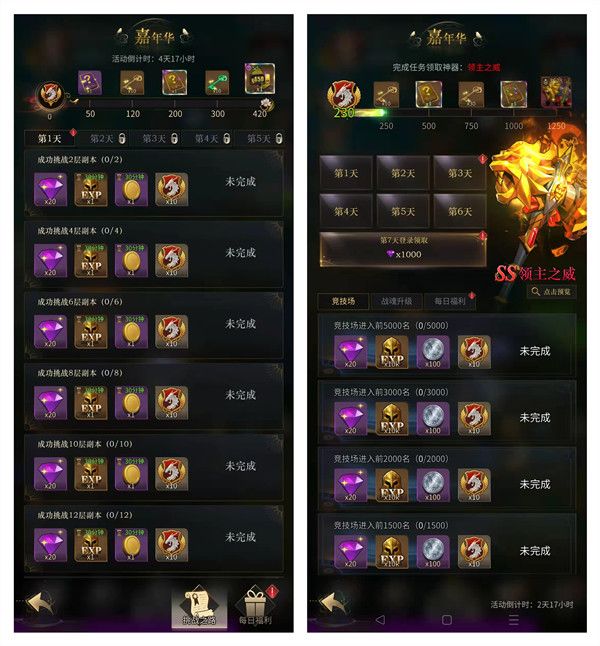 7天嘉年华完成挑战,送极品SS装备——领主之威,更有1000钻石等奢华好礼~