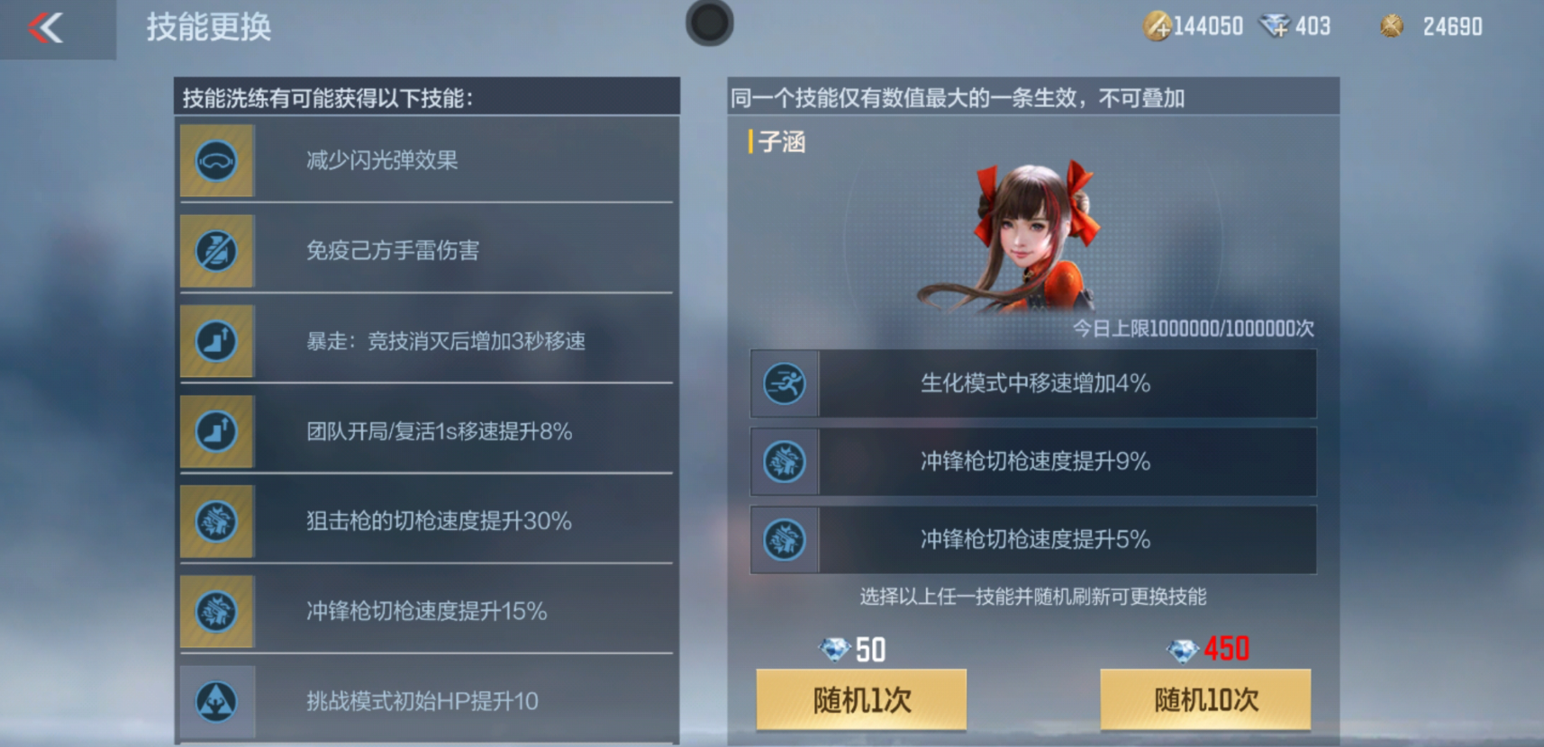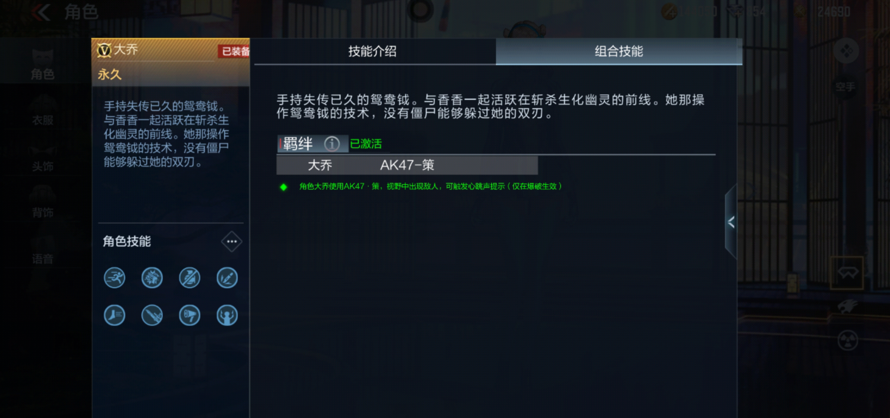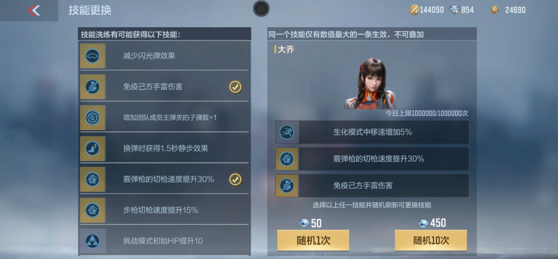 除了高颜值以外,乔月的技能也让人眼前一亮。和子涵、王者零一样,她可以洗练三条随机技能,不过她和前两者略微有些不同,王者零和子涵的技能加快的是狙击枪和冲锋枪的切枪速度,但乔月加快的是霰弹枪和步枪的切枪速度,还增添了一个换弹时获得静步效果的新技能,这配合上AK47-策的中断换弹技能会发生什么呢?咱们慢慢往下看。